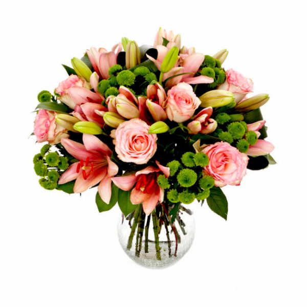 זר פרחים שזור בסגנון קלאסי בגוונים ורוד עדין וירוק בוהק, המשלב ליליות, ורדים וחרצית, ואלמנטים ירוקים. הזר מגיע עם קישוט…