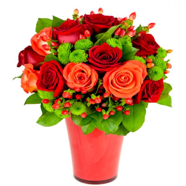 זר פרחים מעוצב בסגנון מודרני בגוונים כתום,אדום וירוק, משלב פרחי כרטמוס, ורדים, חרצית, ואלמנטים ירוקים, מגיע עם קישוט ואריזת יוטה.…